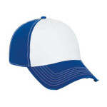 100% polyester athletic mesh with tricot backing * Six panels * Low profile pro-style crown * Fused buckram-backed front panels * Contrasting color fabric on 2 front panels * Contrast color inserts on side and front bill * Matching eyelets * Pre-curved bill * Hook-and-loop fastener