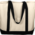 11 ounce 100% cotton canvas* Front pocket* Extra long contrast color self-fabric handles reinforced at stress points* Contrast color double-ply bottom for reinforcement* 5-inch bottom gusset 19 1/2"W x 14 1/2"H x 5"D