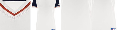 - "R RUSSELL" on bottom of left sleeve