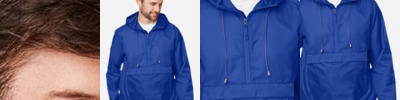 1.77 oz./yd² (US), 2.8 oz./L yd (CA), 100% polyester taffeta Water-resistant finish Rollaway adjustable hood Elasticized cuffs Center front coil zipper with autolock slider Lower front concealed zippered pockets Adjustable shockcord at hem