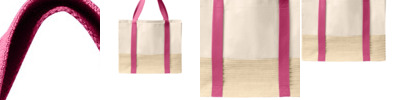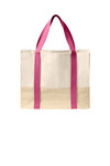 12-ounce, 100% cotton canvas Natural canvas top panel Natural paper ribbon straw lower body Interior hanging pocket Colored web handles Dimensions: 14'h x 18.1'w x 6.7'd Capacity: 2,257.9 cu. in./37 L Weight: 1.26 lbs./0.59 kg Note: Bags not intended for use by children 12 and under.