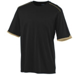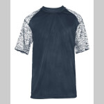Roller printed for easy embellishment * Reduces chance of dye migration * 100% polyester wicking printed knit * Wicks moisture away from the body * Pad print label * Self-fabric collar * Set-in sleeves * Double-needle hemmed sleeves and bottom