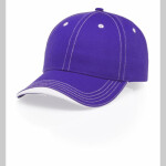 100% cotton twill fabric; low-profile structured crown with buckram-fused front panels; pre-curved PE visor with white wave sandwich visor and four rows of stitching; white contrast color stitching and eyelets; ProSweatband with twill face.